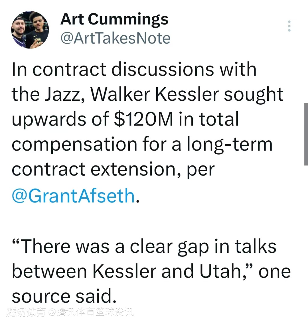 2025-12-13 07:40北京时间12月13日,据记者Grant Afseth报道,有消息人士透露,在与爵士队的续约谈判中,沃克-凯斯勒希望得到一份总价值1.2亿美元以上的长期合同,但爵士队并不愿意满足这一薪资要求。