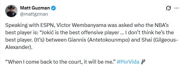 谈及谁是当今NBA最佳球员,文班亚马表示:约基奇是联盟里最顶尖的进攻球员,但我并不认为他是联盟最佳。最佳球员的归属,应该在字母哥和亚历山大之间产生。等我伤愈重返赛场,这就会是我了。