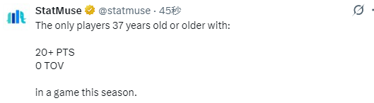 值得一提的是,本赛季至今,只有乐福和杜兰特两位37岁及以上的球员,能在单场比赛中轰下20+得分且保持零失误的亮眼表现。