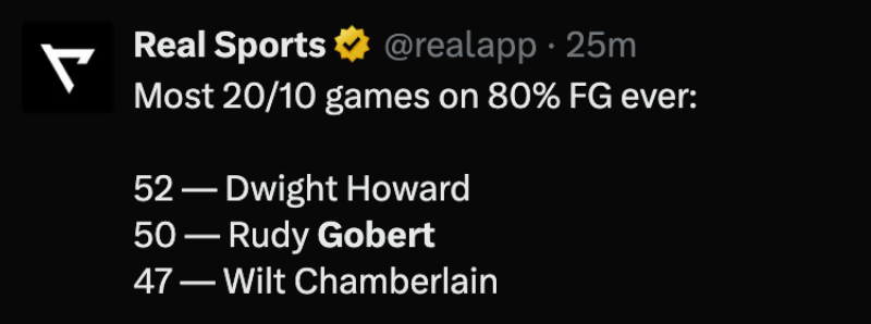 据统计,戈贝尔生涯20+10且投篮命中率来到80%以上的场次为50场,历史第二多,仅次于52场的霍华德,排在第三位的则是张伯伦(47场)。另外,在戈贝尔拿到20+10(篮板)的数据时,森林狼最近5场比赛全部获胜。