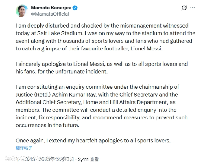对此,西孟加拉邦首席部长玛玛塔·班纳吉公开发文致歉: