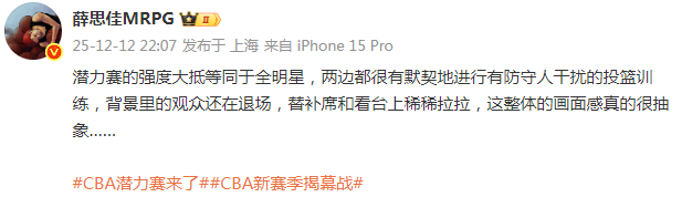 对于潜力赛的强度,该媒体人坦言:“比赛强度和全明星也差不多,大家基本上都在外面投三分……背景里的观众还在退场……太诡异了……”