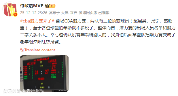 2025-12-13 20:00CBA揭幕战结束后,广厦队和山西队进行了联赛历史上的首场潜力赛,山西队27-24险胜广厦队。本就引发争议的安排,加上引发争议的参赛球员和两队看起来很有“默契”的对抗,这场比赛也引发了媒体人的广泛吐槽。