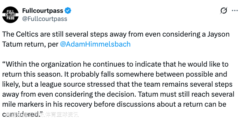 希梅尔斯巴赫表示:“塔图姆本人仍向球队表示,希望能在本赛季回归。理论上,他本赛季复出的可能性介于‘有可能’和‘比较可能’之间,但一位联盟消息人士强调,球队目前甚至还没到‘考虑让他复出’的阶段。塔图姆必须先在康复过程中达成多个关键‘里程碑’,球队才会开始讨论他的复出事宜。”