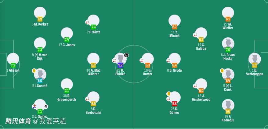 利物浦首发:1-阿利松、2-乔-戈麦斯(26'11-萨拉赫)、4-范戴克、5-科纳特、6-科尔克兹、8-索博斯洛伊(83'14-基耶萨)、10-麦卡利斯特、17-琼斯、38-赫拉芬贝赫、7-维尔茨(78'26-罗伯逊)、22-埃基蒂克(78'9-伊萨克)