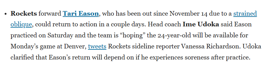 火箭队随队记者瓦妮莎-理查森报道,主帅乌度卡透露,伊森已于周六参与训练,球队期待这位球员能够出战周二客场对阵掘金的比赛。乌度卡同时表示,伊森能否复出,将取决于他在训练后是否出现肌肉酸痛反应。