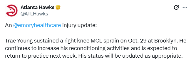 2025-12-14 06:50北京时间12月14日,老鹰官方更新球队伤情报告,特雷-杨于10月30日对阵篮网的比赛中遭遇右膝内侧副韧带扭伤,目前他正持续增加康复训练量,预计下周重返训练场,其伤情进展将适时更新。
