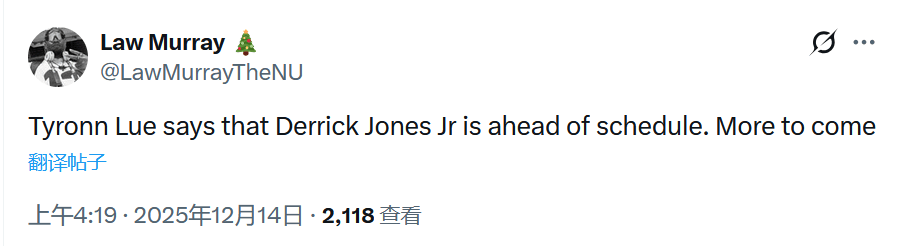 此外,泰伦卢还谈到德里克-琼斯的伤病恢复情况,泰伦卢表示他已经开始进行一些三对三的训练,恢复进度比预期要快。在11月17日对阵凯尔特人的比赛中,德里克·琼斯膝盖受伤一直休战至今。本赛季他只出战13场,场均可以得到10.5分2.4篮板1.1助攻。