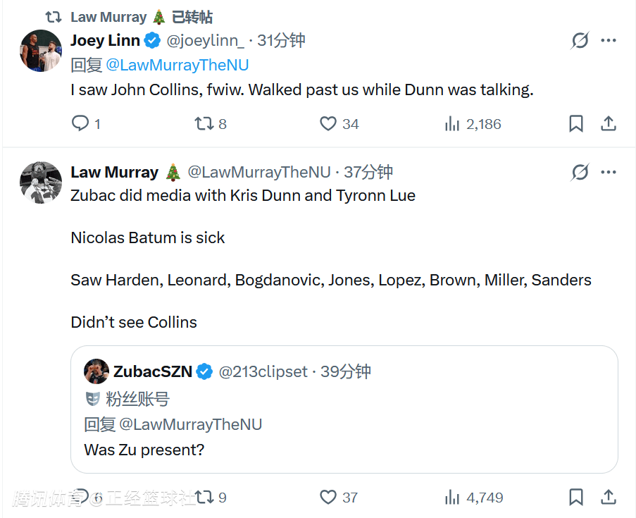 另一位快船随队记者Joey Linn更推表示:“我看到了约翰·科林斯,邓恩讲话的时候,他从我们身边走过。”