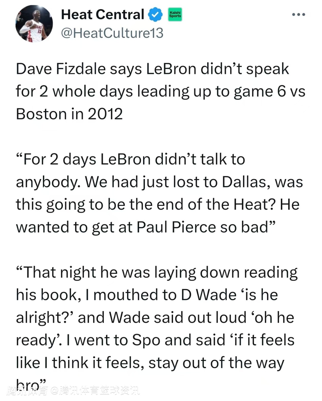 菲兹戴尔:12年东决G6赛前 詹姆斯连续两天没和任何人说话