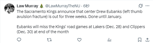 国王官方:尤班克斯左手拇指撕脱性骨折 将缺阵3周明年1月复出