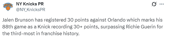 2、布伦森尼克斯生涯第88次单场30+,超越里奇-盖伦,成为尼克斯队史上第三多的球员;仅次于安东尼(108次)和尤因(203次)
