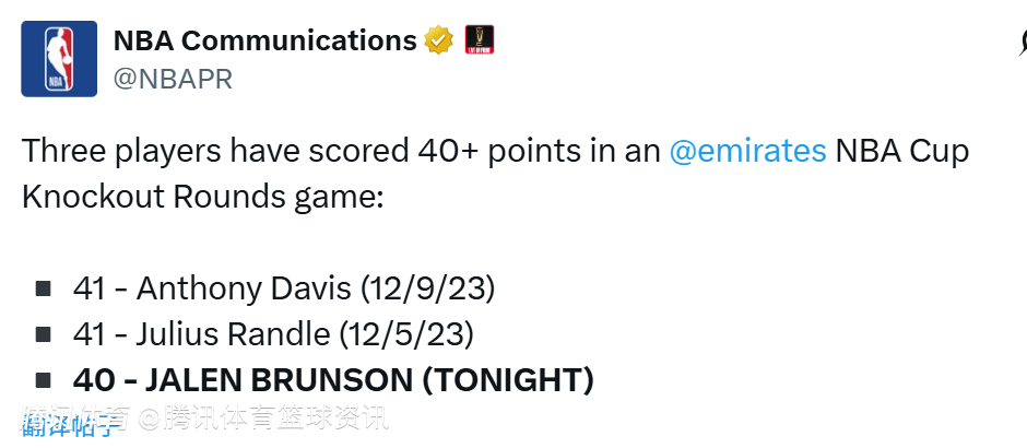 据NBA官方统计,已有三位球员在NBA杯淘汰赛单场砍下40+得分: