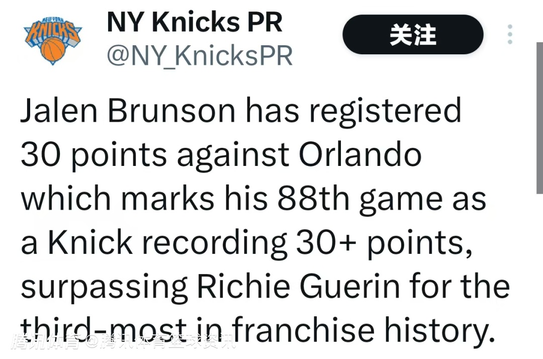 另据尼克斯官方统计,凭借本场比赛表现,布伦森在效力尼克斯期间第88次单场得分30+,超越里奇-盖伦,独占队史第三位。