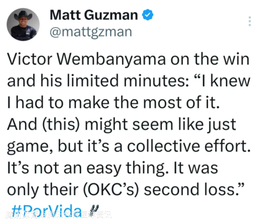文班亚马:我知道自己的出场时间有限,所以必须充分利用。队友们的表现堪称完美。能战胜这样的对手意义重大。这场比赛看似普通,实则凝聚了全队的努力,绝非易事——这是他们本赛季的第二场失利,这一结果分量十足。