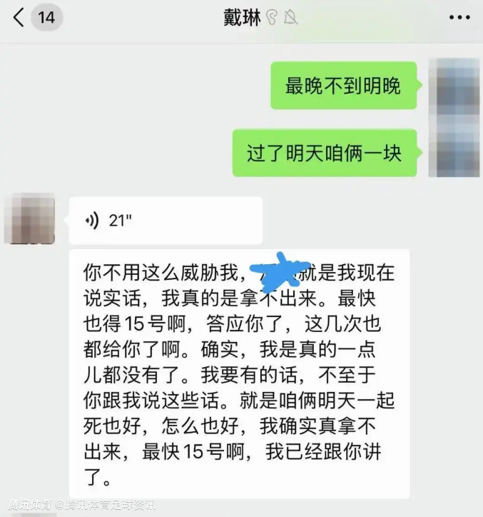 “这是第一次,当时戴琳也是许诺了一个分期还款计划,其实周期挺长的,但是过了大概一个月,这个球迷又找到我,戴琳没有完全兑现他的诺言还款。”李平康说,这个球迷病情恶化,确实需要钱,他又第二次发了微博。随后戴琳再次找到该球迷,进行言语辱骂,并表示再继续发微博将一分钱也不还。随后戴琳又再次还款4000元,要求删除微博。“因为这钱够他做一个小手术了,在戴琳的进一步恐吓下,球迷说想让我给删掉,我就隐藏了微博。”