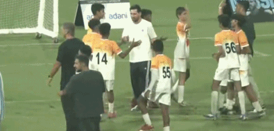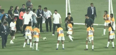 梅西、德保罗、苏亚雷斯还参加了印度小球员的抢圈游戏,在被小球员穿裆之后,苏亚雷斯露出了不可思议的表情。在抢圈之后,三人与众多小球员一起合影留念。随后,梅西与印度传奇球星切特里合影,还赠送了自己的球衣。