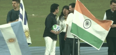 作为这次活动的最后一个环节,板球传奇巨星萨钦-滕杜卡尔走上看台,与梅西握手,并且向梅西赠送了10号球衣。