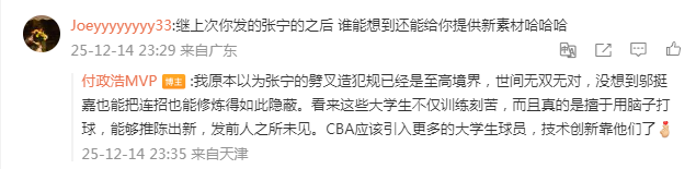 “虽然徐杰受伤令人揪心,但从篮球技艺传承创新的更高层面来看,今晚邬挺嘉展现出一代宗师的潜质,给球迷带来了新惊喜。劈叉投篮已不鲜见,但难得的是,今晚在此基础上又融合了传统武术勾脚尖的凤凰步,让你躲过初一也躲不过十五。”