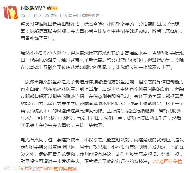 “劈叉投篮推陈出新再出新连招!徐杰今晚在扑防邬挺嘉的三分投篮时出现了惊魂一幕:被邬挺嘉脚尖勾翻,失去重心后直接从空中摔倒在球场边缘。随后送医缝针,眉骨处缝了三针。”该媒体人在社媒上写道。