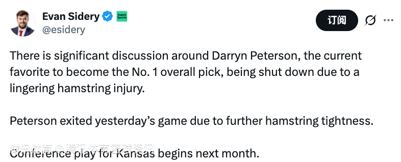 2025-12-15 01:20北京时间12月15日,据美记Evan Sidery报道,明年状元热门达林-彼得森,外界正在热议他可能因持续存在的腿筋伤势而被球队直接停赛亦或是保护性休战。