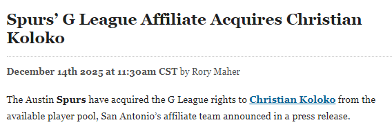 前湖人内线再就业!奥斯汀马刺官宣:球队认领科洛科G联盟签约权