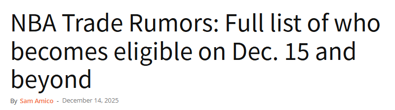 2025-12-15 07:30北京时间12月15日,在NBA的赛程日历上,本周二(北京时间12月16日)是一个关键节点——今夏签下绝大部分自由球员合同的球员将从即日起具备被交易资格。换句话说,NBA的交易市场一下子多了77个可供选择的目标,这也意味着球队谈判的范围和筹码明显增加,大大提升了交易达成的可能性。
