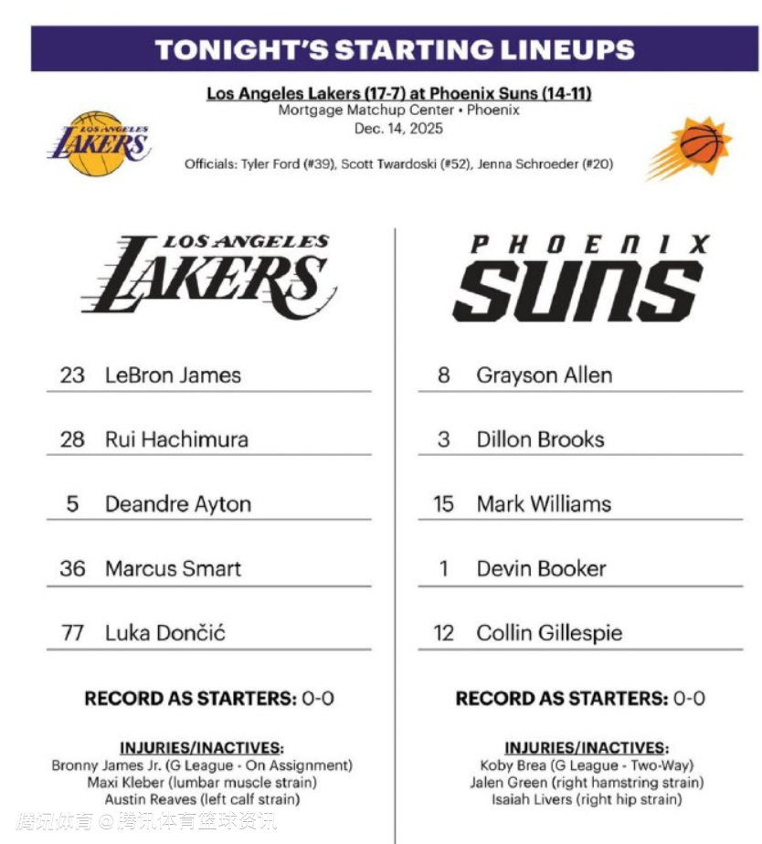 2025-12-15 08:50北京时间12月15日,NBA常规赛继续进行,湖人将在今天早上9点客场对阵太阳,赛前双方的首发阵容出炉。