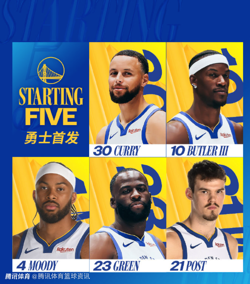 勇士首发五虎如下:追梦、穆迪、波斯特、库里、巴特勒。相较于上一场对阵森林狼的首发五虎,科尔进行了变阵,用穆迪和回归的追梦,替换掉了希尔德、斯宾塞。