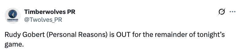 2025-12-15 10:00北京时间12月15日,NBA常规赛,森林狼和国王的比赛进行中,森林狼官方宣布,戈贝尔因为个人原因,本场比赛不会回归。