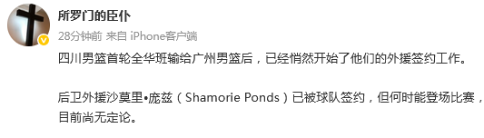 结束新赛季全华班征程!媒体人曝四川签下后卫外援沙莫里•庞兹