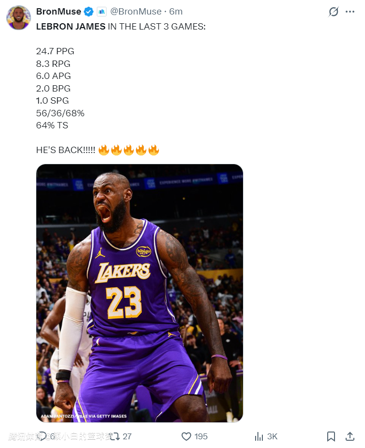 湖媒晒出詹姆斯最近三场的数据写道:国王归位了。