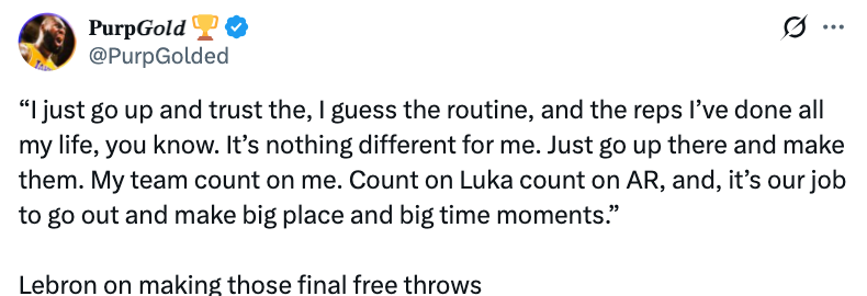 谈及最后命中的那些罚球,詹姆斯表示:“我只是走上罚球线,相信自己这么多年练出来的节奏和肌肉记忆而已。对我来说没什么特别的,就是上去把球罚进。队友们信任我,也信任东契奇、信任里夫斯,我们的职责就是站出来,在关键时刻打出好球。”