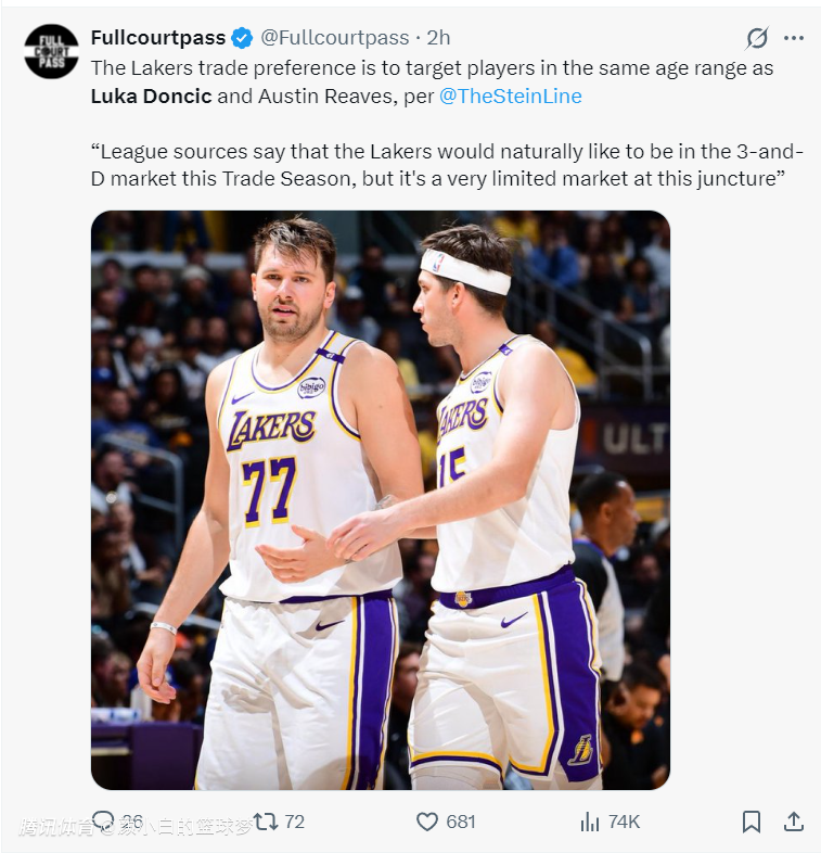 赛前根据NBA记者马克-斯坦恩的报道,洛杉矶湖人队没有兴趣交易东契奇、里夫斯,球队会围绕这两位后场建队,他们正在努力找寻跟这两人的年龄匹配的3D侧翼球员。