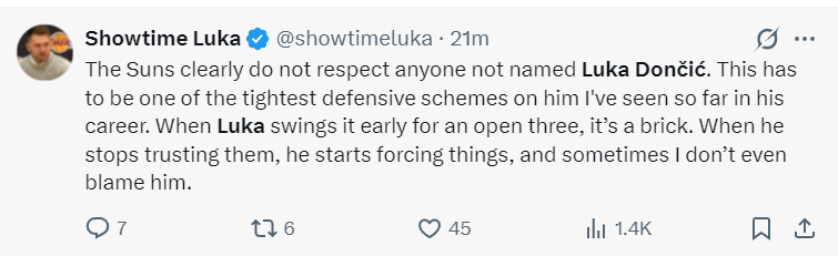 但东契奇的球迷这样评价:太阳队显然对除卢卡-东契奇之外的任何球员都不屑一顾。这可能是我职业生涯中见过针对他的最严密的防守策略之一。谁东契奇为队友创造空位后对方总能封盖成功,东契奇不再信任队友自己强攻,所以命中率不高,我一点都不怪他。