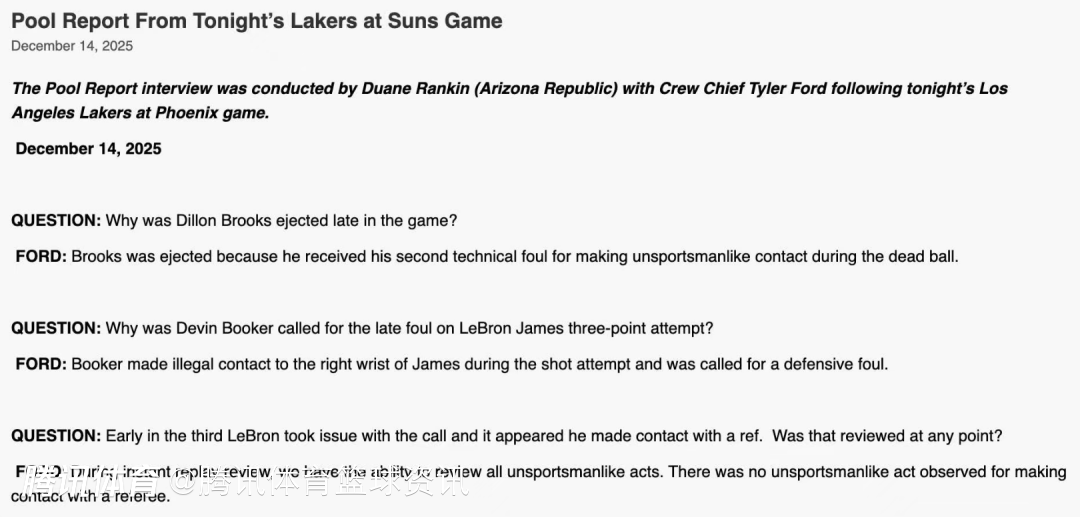 2025-12-15 13:50北京时间12月15日,NBA常规赛继续进行,湖人以116-114战胜太阳。比赛最后时刻出现争议吹罚,裁判组负责人泰勒-福特接受采访并予以回应。