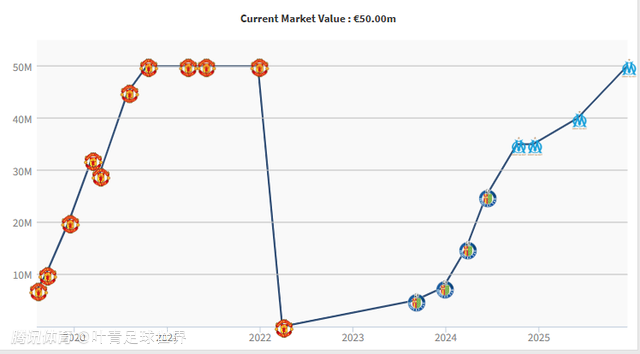 2023-24赛季,格林伍德被租借到赫塔菲,36场贡献10球6助。从零起步的格林伍德,身价不断上涨:500万、750万、1500万,去年夏天离开赫塔菲时,格林伍德已经打出2500万欧元的身价。在马赛1年半,青木57场36球10助,身价涨回到5000万欧元。
