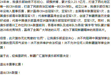 随后,新疆男篮一度选择退出CBA的方式逼迫篮协收回决定,否则将会退出继续投资中国篮球。双方长时间拉扯阶段。
