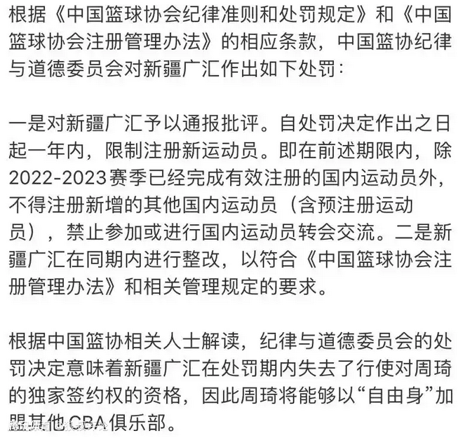 中国篮协发布对新疆广汇篮球俱乐部的处罚通知后,后者将会禁止注册球员,周琦重新获得自由球员的身份,自身能决定去哪儿打球。