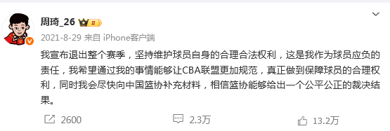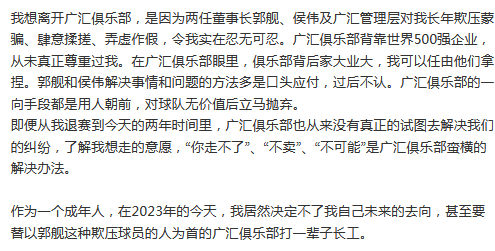 周琦在个人社媒做出更多的爆料,与新疆广汇俱乐部已经达到无法合作的地步,尤其是一些高层的矛盾公开化。