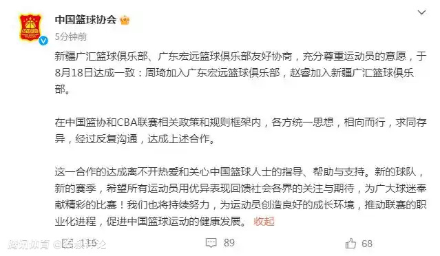 2023年8月份,男篮世界杯正式开打前,中国篮协推动了周琦、赵睿的互换,两人各自离开老东家的方式结束了这一场闹剧。