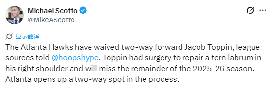 雅各布-托平因右肩盂唇撕裂接受了手术治疗,将缺席2025-26赛季的剩余所有比赛。此次裁人也为老鹰队腾出了一个双向合同名额。