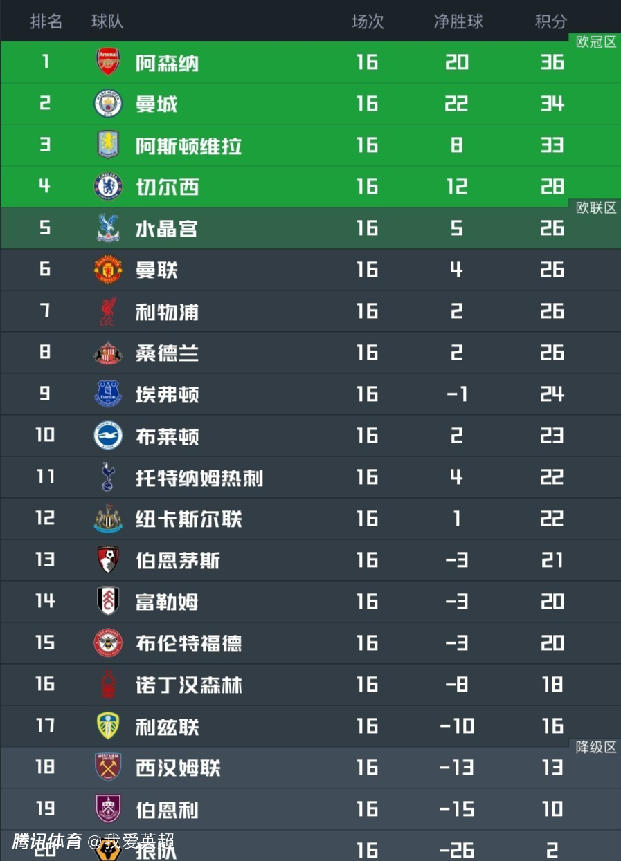 本轮战罢,领头羊阿森纳仍领跑。但身后的曼城和维拉给他们施加了巨大压力,在不断连胜后,两队距离阿森纳分别只有2分和3分。