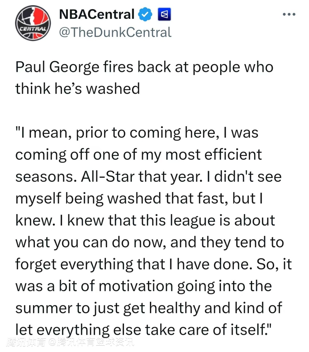 乔治回击过气言论:来76人前我刚打出生涯高效赛季之一 联盟现实只看当下
