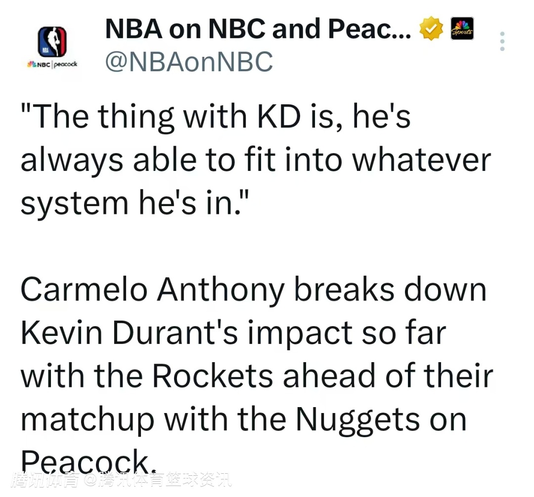 2025-12-16 09:50北京时间12月16日,NBA名宿卡梅隆-安东尼在直播节目中,详细剖析了杜兰特加盟火箭至今带来的影响。他表示杜兰特的过人之处在于总能完美适配任何战术体系。