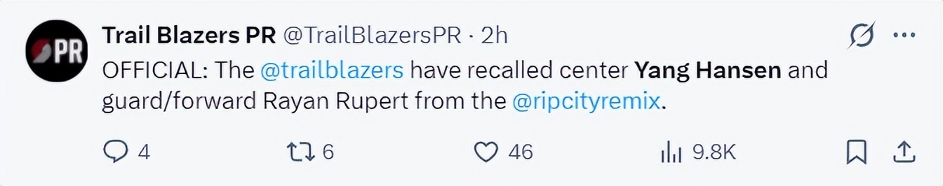 在这场比赛打完后,开拓者官方又召回杨瀚森跟主队一同训练,但在训练后大概率又会被下放继续打G联赛的比赛。