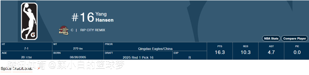 目前杨瀚森在G联赛,场均28分钟,拿到16.3分10.3篮板4.7助攻0.8抢断1.4盖帽,他打G联赛很轻松很愉快,唯一的软肋可能就是体能了。