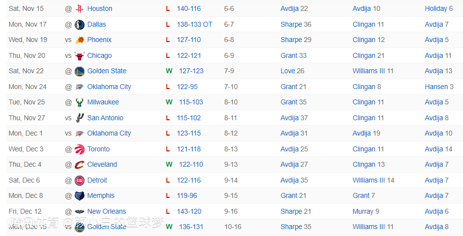 过去的15场比赛开拓者只击败了雄鹿、两场勇士、骑士,就连独行侠、公牛都输了。