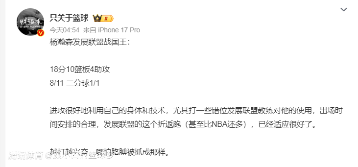 国内的博主也认为,杨瀚森进攻端可以很好的利用自己的身体与技术,发展联盟教练对他的使用也很合理。