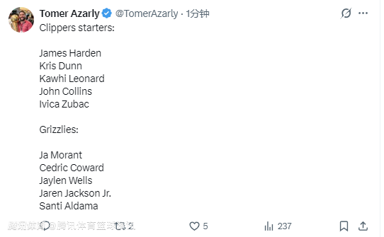 快船vs灰熊首发:莱昂纳德领衔出战 哈登对决莫兰特